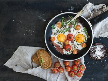 Grilled skirt steak with eggs your way, rice, beans, and tortillas.*
